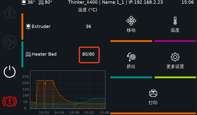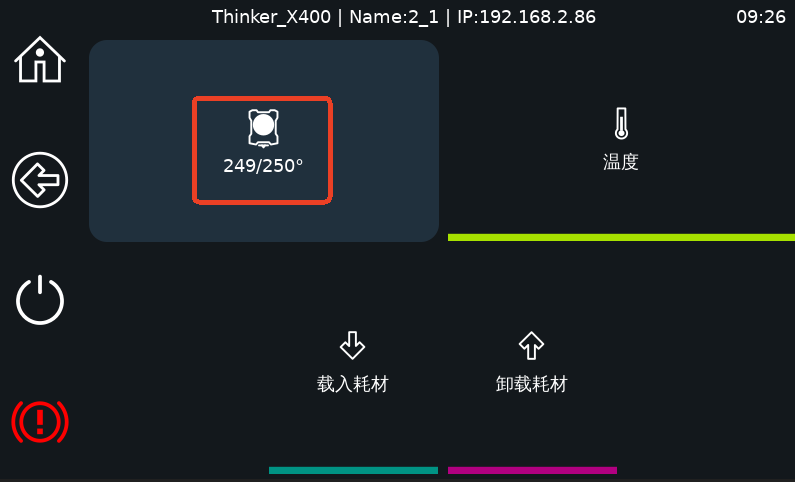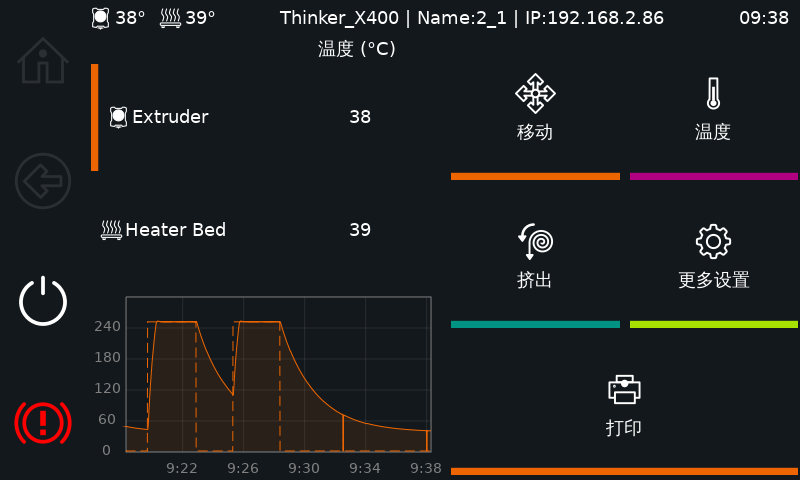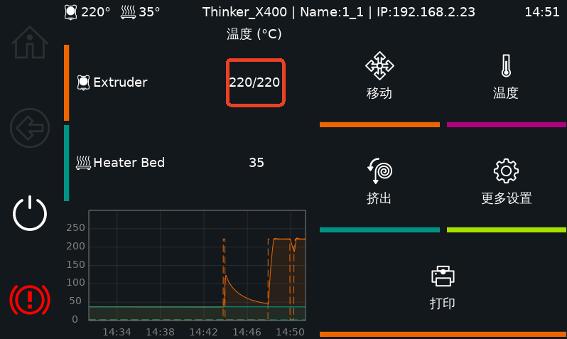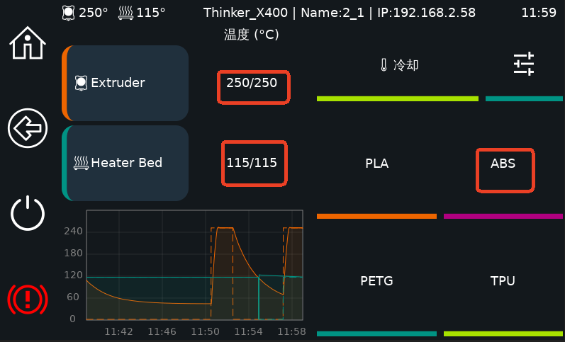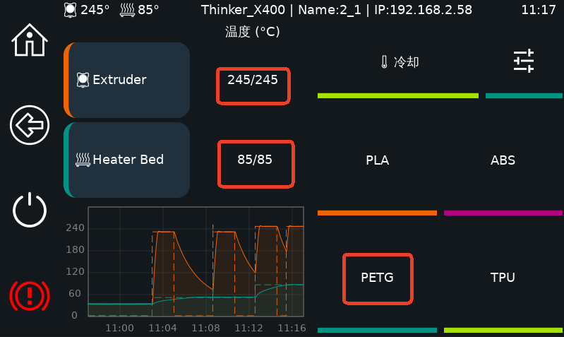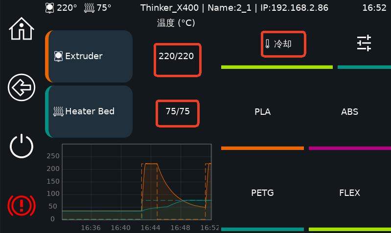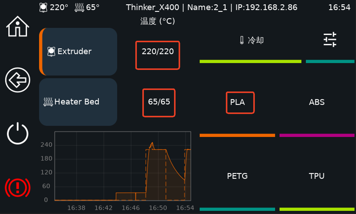 冷却:点击之后喷嘴和热床温度将会缓慢降到环境温度