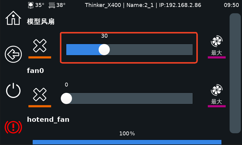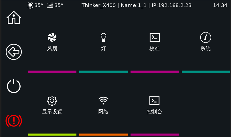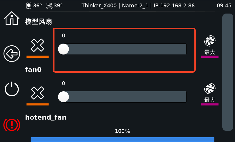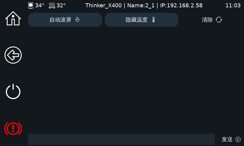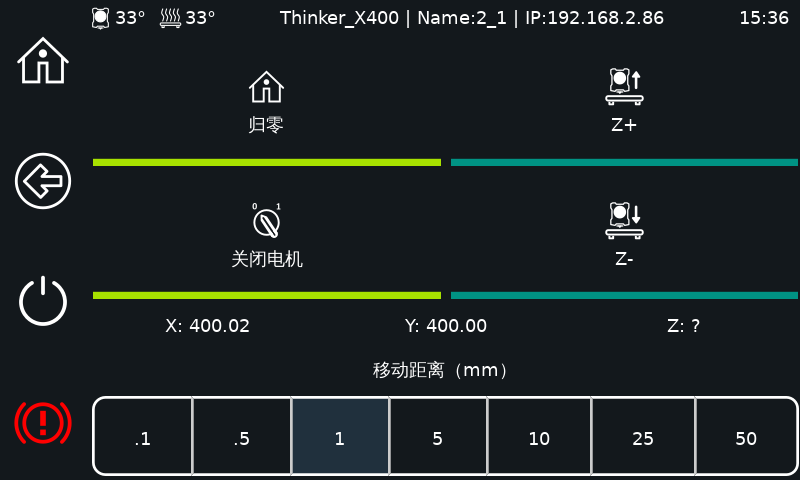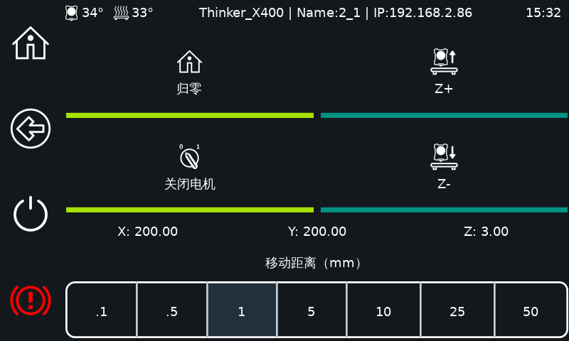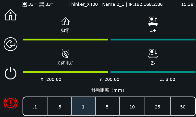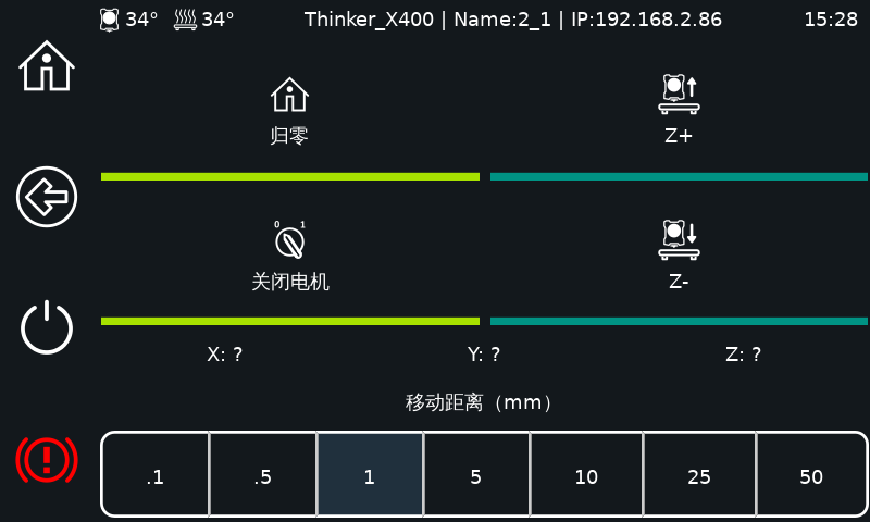 注意:上述操作,若两分钟期间无其他指令,打印机将自动关闭电机(关闭电机:点击关闭后即可手动移动挤出机X、Y轴方向)