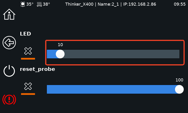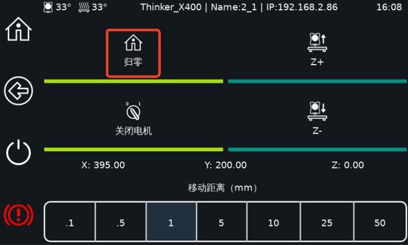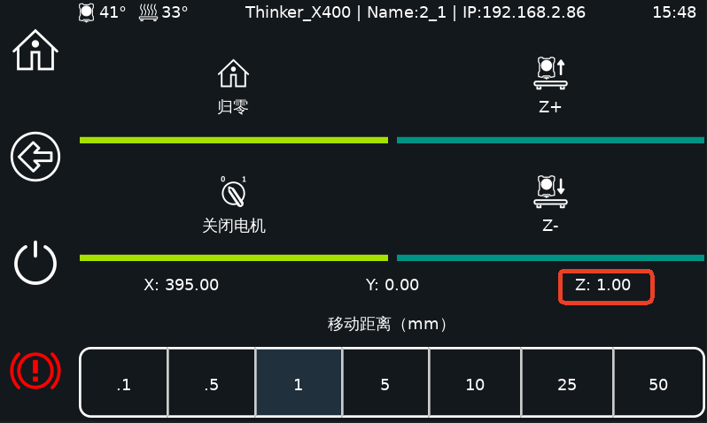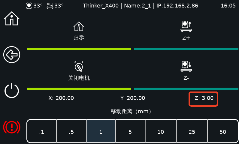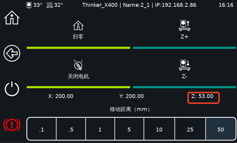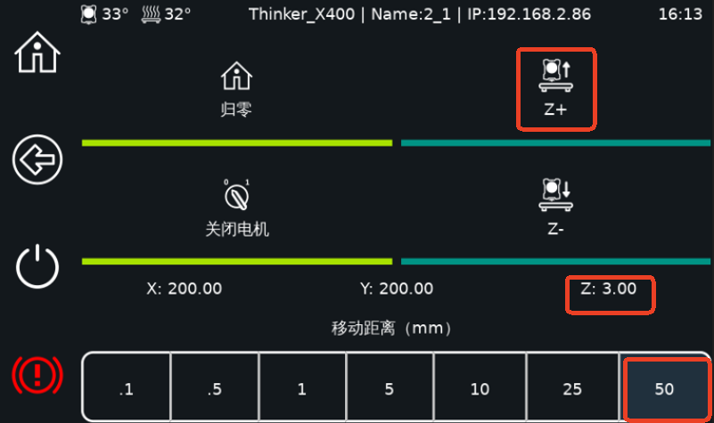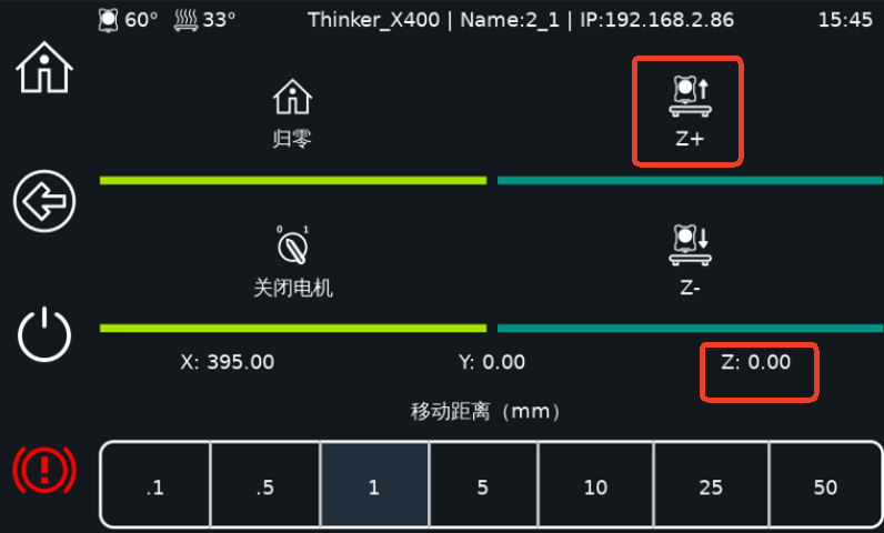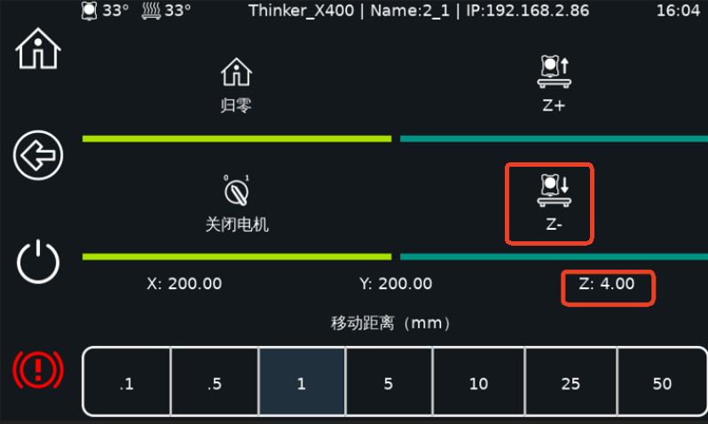 Z-:点击下方数值,再点击Z-,挤出机将向下降低高度