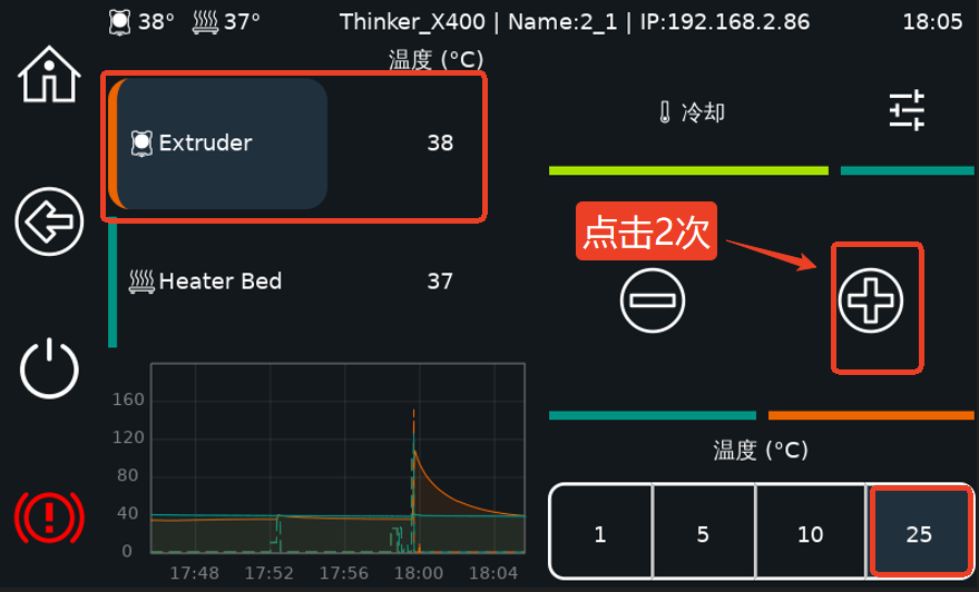 例如:把喷嘴加热到50℃,则需要点击2次“+”符号