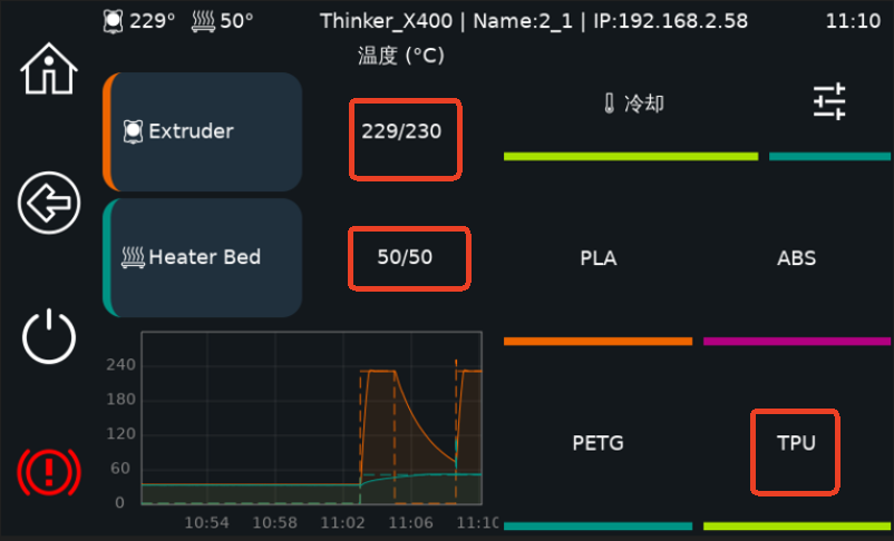 TPU:喷嘴加热到230℃,热床加热到50℃