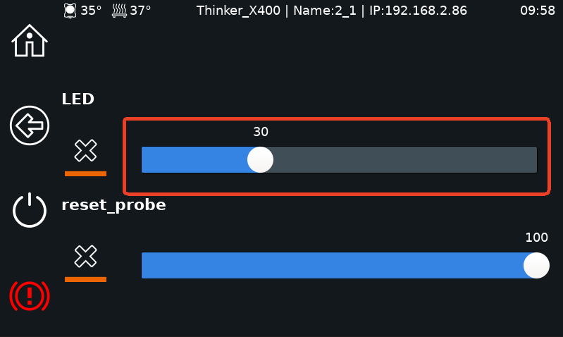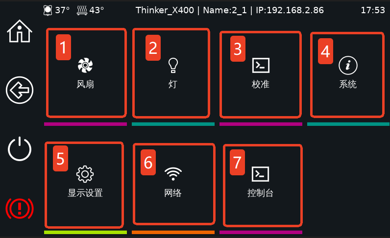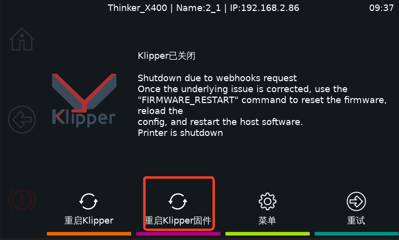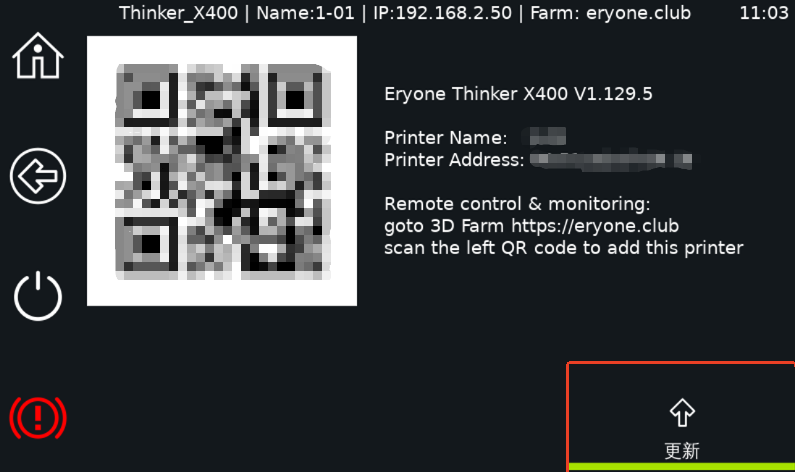 注意:更新固件后,返回主界面时会出现重新启动打印机的提示框,重启后的系统为最新版,否则版本仍将保持为之前的状态。