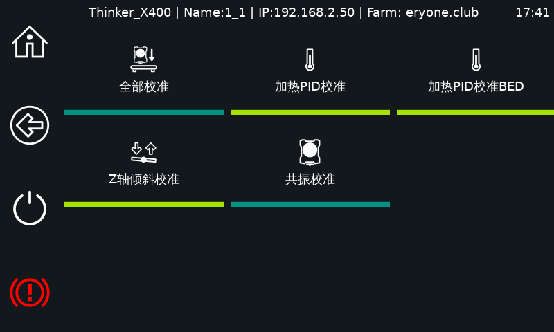 全部校准:点击将进行共振校准、加热PID校准、加热PID校准BED和Z轴倾斜校准测试