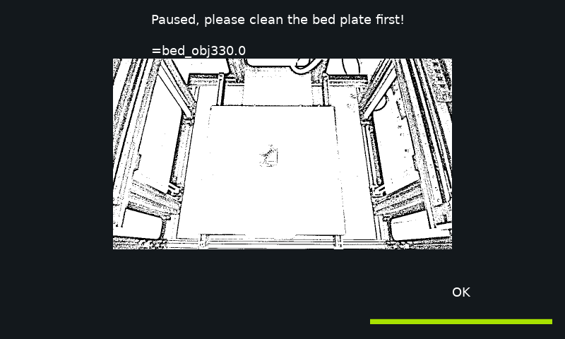 AI Camera:当PEI金属板上的模型未被取走,打印机开始新的打印任务时,AI Camera可以通过摄像头识别到模型并暂停打印任务,同时打印机屏幕上会出现此模型图片