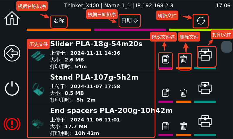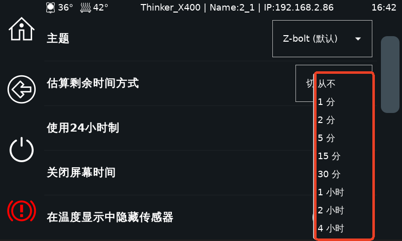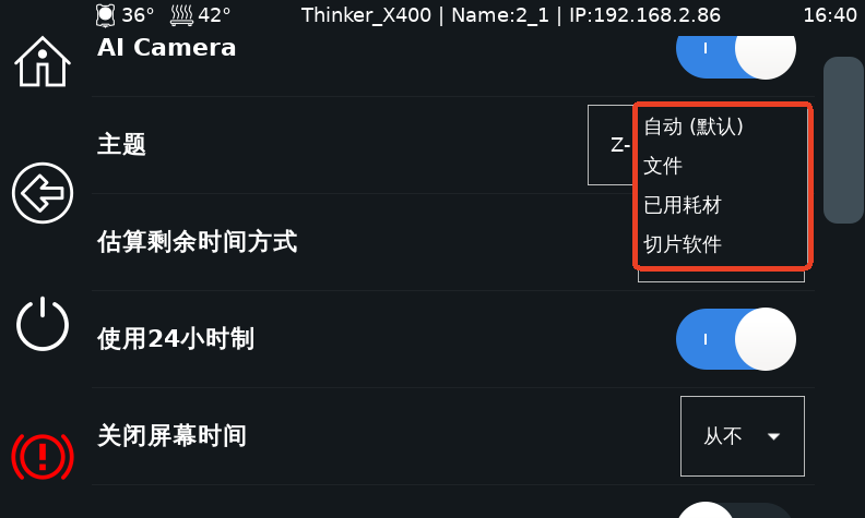 估算剩余时间方式:有“自动”“文件”“已用耗材”“切片文件”.4种计算方式来预测剩余打印时间