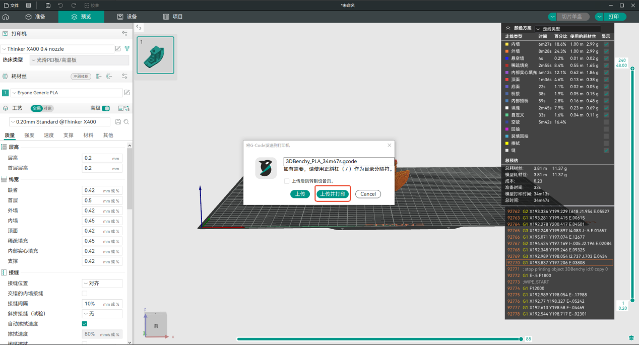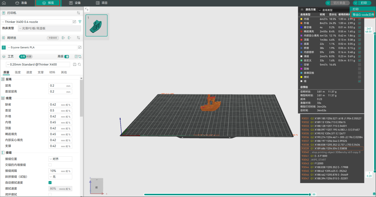 5.方法1:预览并将切片文件导出为gcode文件,将文件传入到U盘里,然后将U盘插入到打印机上进行打印